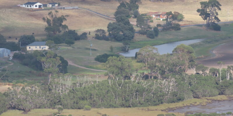 From the lookout, we could see the surrounding countryside unfolding in every direction. Green farmland dotted with trees spread inland, while the coastal towns appeared as small clusters of rooftops far below. In the distance, various bodies of water curved gently north and south, fading into a hazy blue sky.