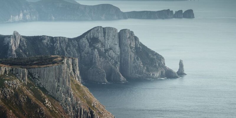 It is easy to imagine what this coastline must have looked like long ago. The Three Sisters were once part of the mainland, connected to the cliffs of Table Cape. Over countless years, the ocean carved away at the softer sections of rock, gradually separating these pillars from the land. What remains today are the last fragments of that ancient connection, standing proudly in the water.