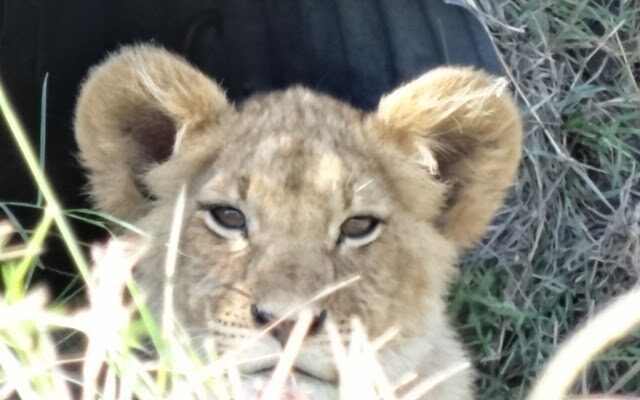 October 6, 2013, I wrote: After a considerable wait this morning, we were able to get this shot of a young lion with his head jutting out of a culvert. The mother and babies were living in the culvert for protection. The photo was blurry since my hands were shaking with excitement over seeing this amazing situation in the Maasai Mara, Kenya. For more photos, please click here.